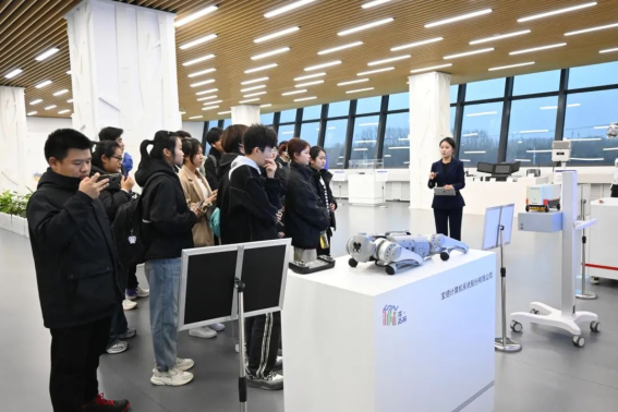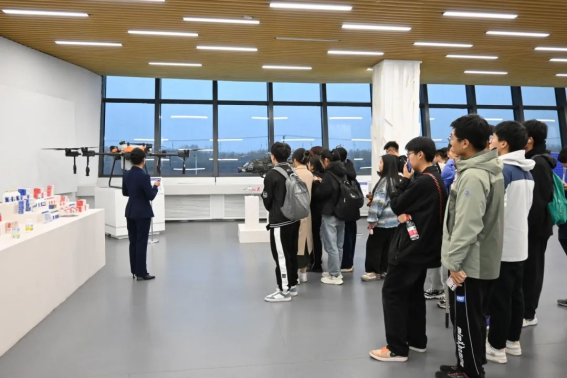 深圳精品展示中心中展览着园区企业科技产品,一件件高新科技产品的背后,是园区以商业航天、信创、机器人、新材料等产业为突破口,着力招引龙头企业,带动上下游产业链集聚式的发展理念,激励着未来学子将“产学研用”深度融合,也增强了学院对于“科教+产教”双融合育才理念的实践意义。