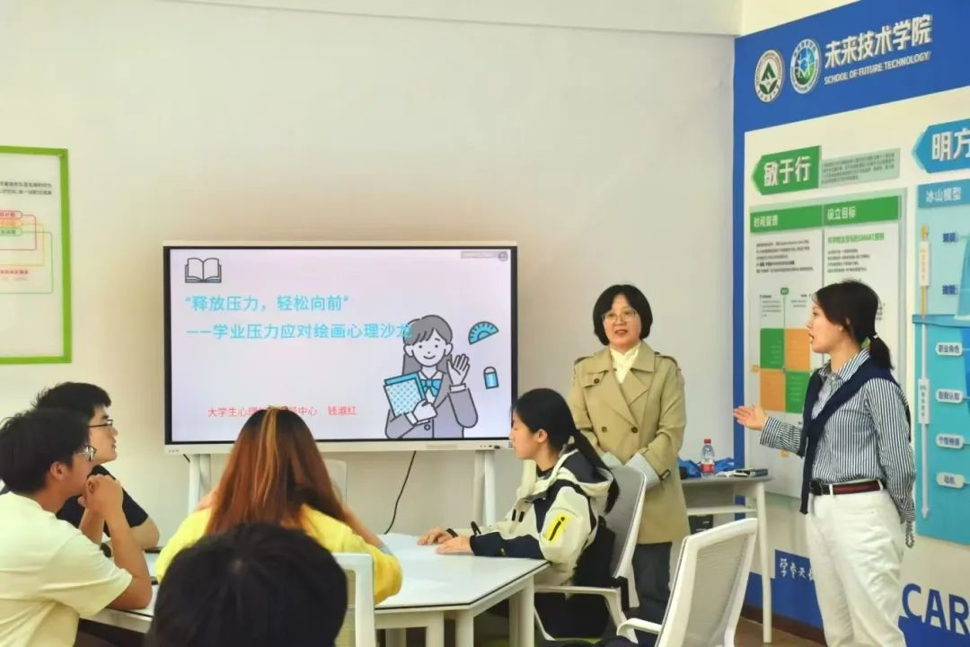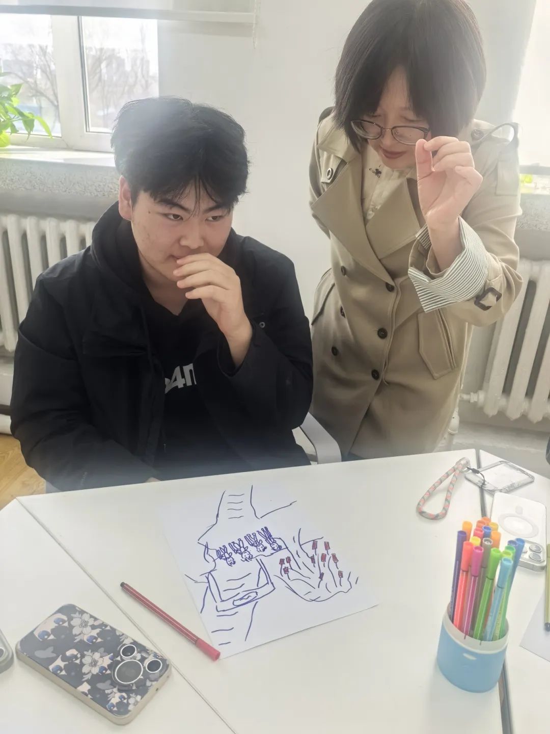 围坐分享时,同学们惊讶于彼此画作的“共鸣感”,对一些不约而同的细节所喜悦:不止自己有这些压力,大家原来都是一样的,在面对不同压力的情况我们都会有些相同的应对方法。钱老师特别强调:“绘画分析不是标签化解读,而是通过具象化的场景,让我们跳出‘我应该怎样’的执念,看见‘我正在怎样’的真实——这本身就是释放压力的开始。”