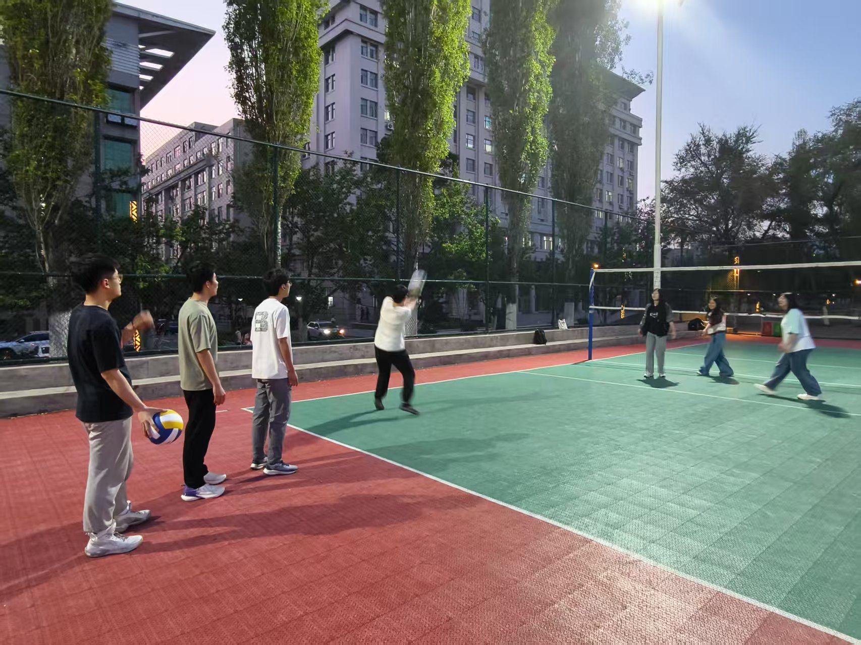 排球如白鸽掠空,队员目光凝定,手腕轻抖间球影翩跹。垫传弧线似弦月,步伐交错如舞步。同学们相互鼓励点拨,默契于无声中生长,击球声与喝彩交织成春日的韵律。