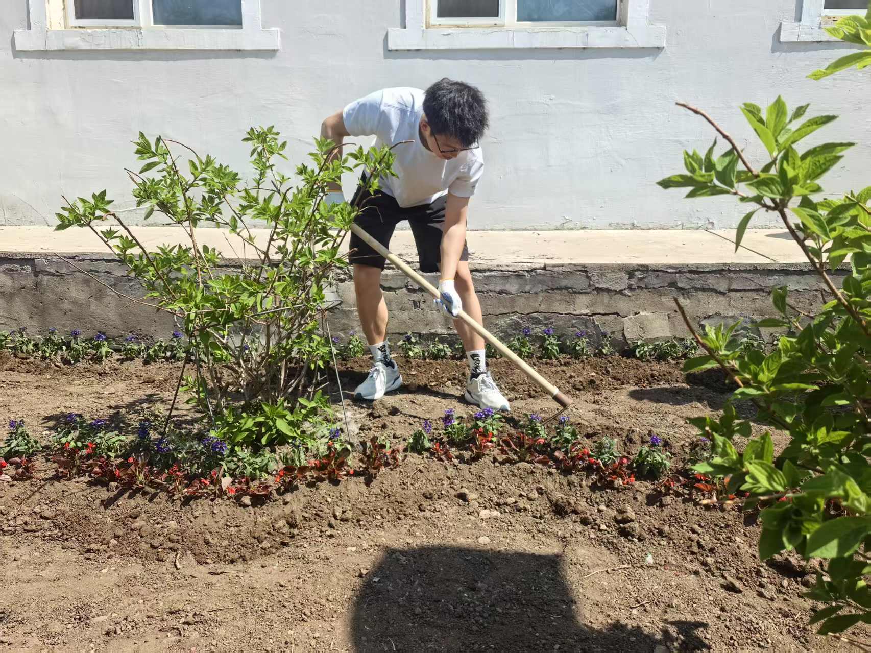“原以为种花是风雅事,没想到是体力活!”刚完成翻土作业的林学专业学生邹智博坐在花园边。在持续2小时的实践中,学生分组完成83平米花园翻土、育苗、覆土和浇水。校园建设处特别选用一串红、鼠尾草、凤仙、美人瑛等易成活品种,但严格的株距要求仍让新手们手忙脚乱。“株距保持15厘米”——林学专业课本上的数据,在实践中变成满地弯腰测量的身影。当喷淋洒水时,看着水流精准浸润自己播下的花苗,学生们对着泥泞的球鞋笑称:“这才叫‘深度学习'。”