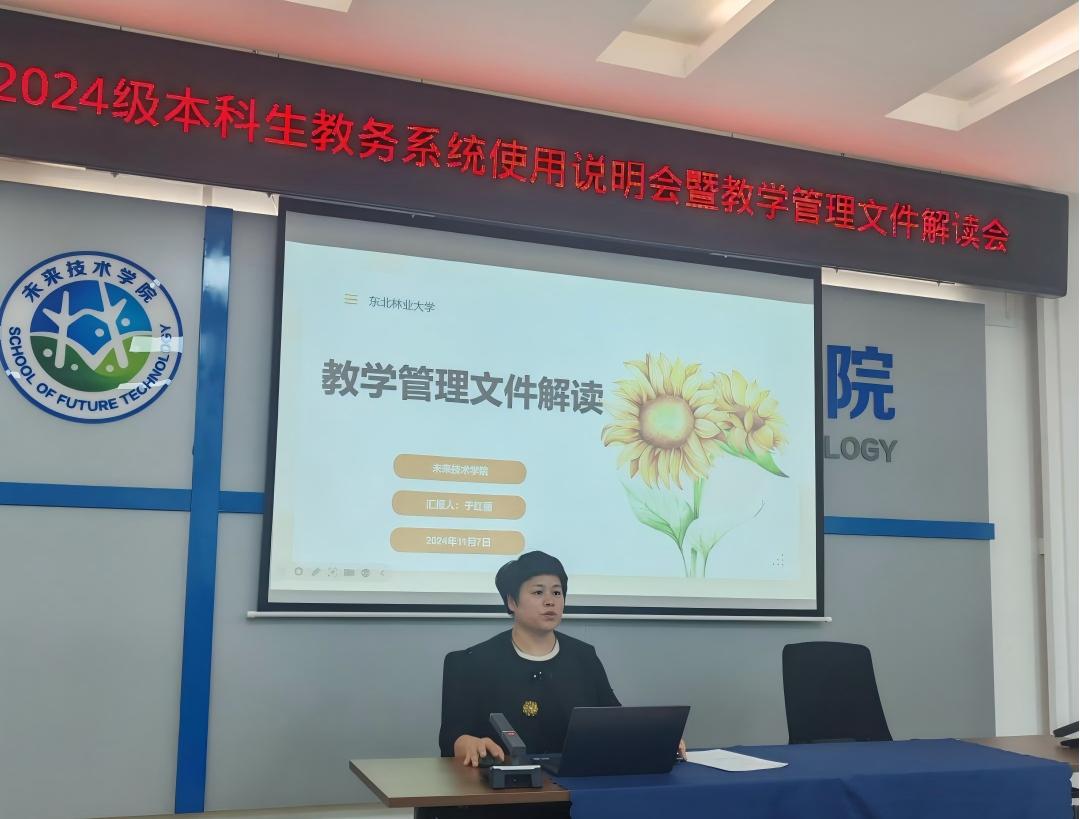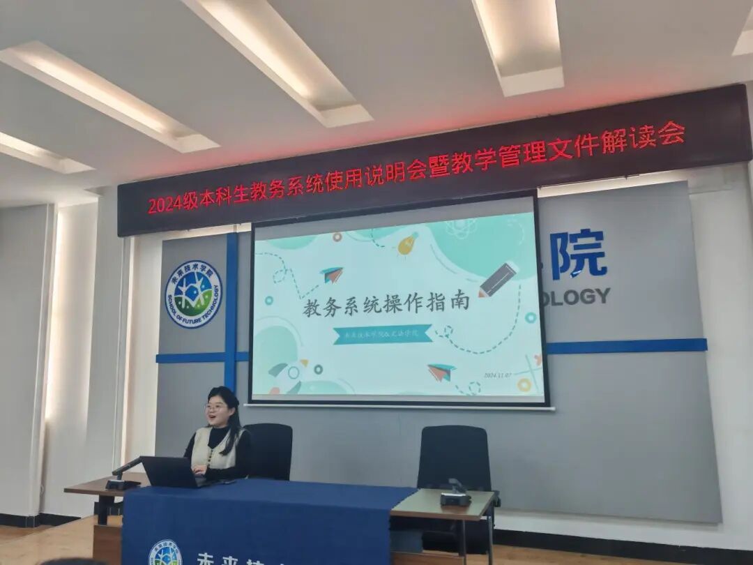 为维护学校正常教育教学秩序,帮助2024级本科同学深入了解学校教学管理相关文件及培养方案、教务系统使用方法,指导学生顺利完成学业,促进学生全面发展。11月7日下午于未来技术学院214会议室召开教务系统使用说明暨教学管理文件解读会。本次会议由教学秘书于红丽老师、文法学院教学信息中心主任张紫涵同学主讲,未来技术学院2024级全体本科生参加。本次会议由未来技术学院实习辅导员张晋榕老师主持。